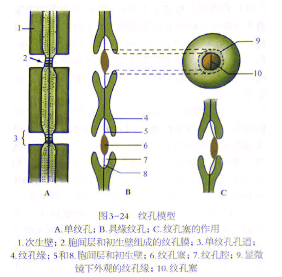 • 纹孔:植物细胞次生壁形成时,初生纹孔场不被次生物质覆盖,形成的凹陷区域,是相邻细胞间进行物质交换的重要通道。