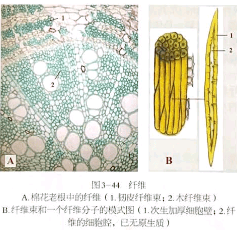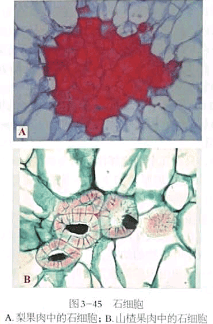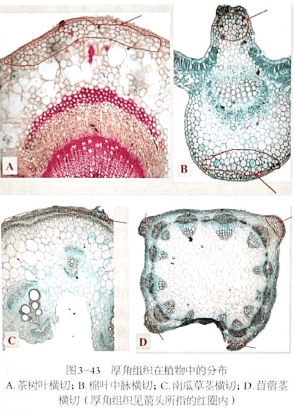 • 机械组织:机械支持作用,厚角组织(初生的机械组织,厚角细胞组成,细胞壁(初生壁)不均匀加厚,角隅部分加厚,eg.芹菜、南瓜茎和叶柄);厚壁组织(同时有初生壁和次生壁的厚壁细胞组成,均匀增厚的次生壁且常木质化,分为纤维石细胞