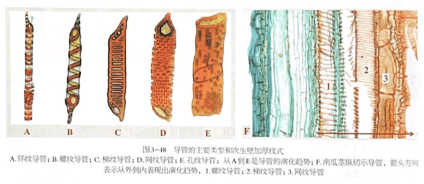 • 输导组织导管(存在于被子植物木质部,每一个细胞称为导管分子,侧壁不同程度地增厚和木化,具纹孔,发生水的横向运输)(环纹、螺纹、梯纹、网纹、孔纹);管胞(多数石松、蕨类、裸子的唯一输水结构,大多被子植物中导管和管胞同时存在)