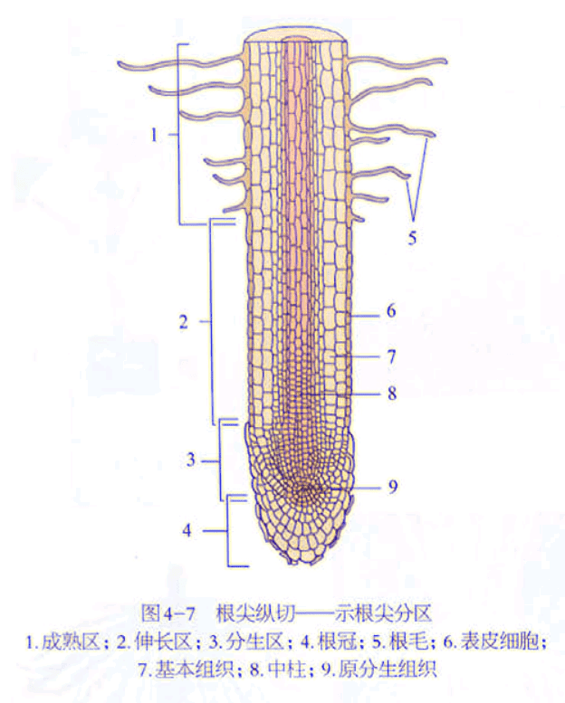 • 根尖的结构根冠(根尖顶端、保护根尖分生区);分生区(最前端的中心部分有不活动中心);伸长区(细胞逐渐液泡化,逐渐分化出不同组织);成熟区根毛区,有根毛)