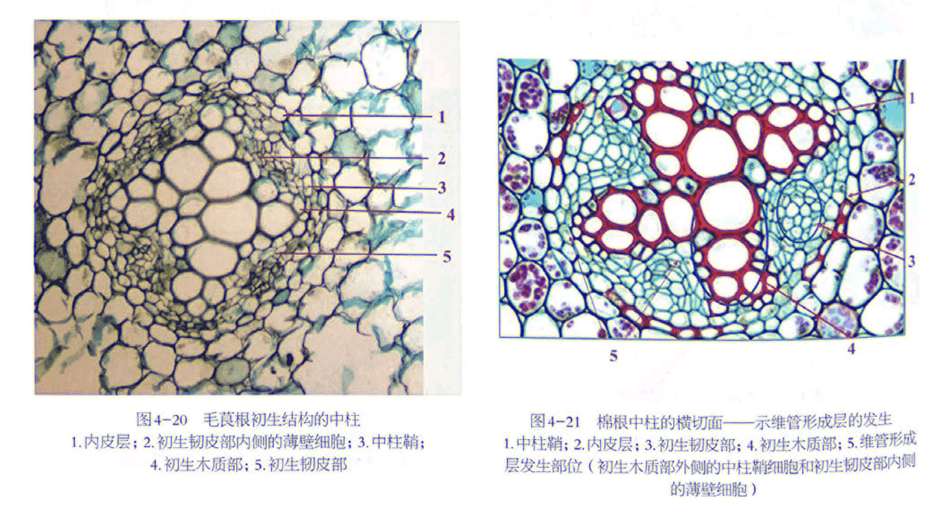 • 中柱(维管柱,内皮层以内所有组织的统称)(包括中柱鞘初生木质部初生韧皮部薄壁细胞四部分) 中柱鞘:潜在分生能力 初生木质部(外始式):导管、管胞、木纤维和木薄壁细胞组成;原生木质部(尖端、口径小、环纹、螺纹导管);后生木质部(近中心部位,口径大,多为网纹、孔纹、梯纹导管) 初生韧皮部(外始式):筛管、筛胞、韧皮纤维和韧皮薄壁细胞组成;外方原生韧皮部,内方后生韧皮部 薄壁细胞:中间,双子叶的根次生生长时成为维管形成层的大部分,根初生结构刚形成时,中柱中央薄壁细胞尚未发育形成后生木质部,称为