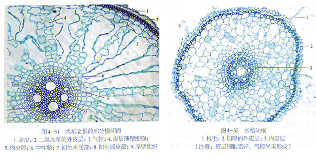 • 外皮层(表皮下方1至数层):水稻2层(内层厚壁细胞);小麦几层薄壁细胞…… 根发育后期外皮层的薄壁细胞的细胞壁增厚成为厚壁组织,支持和保护作用