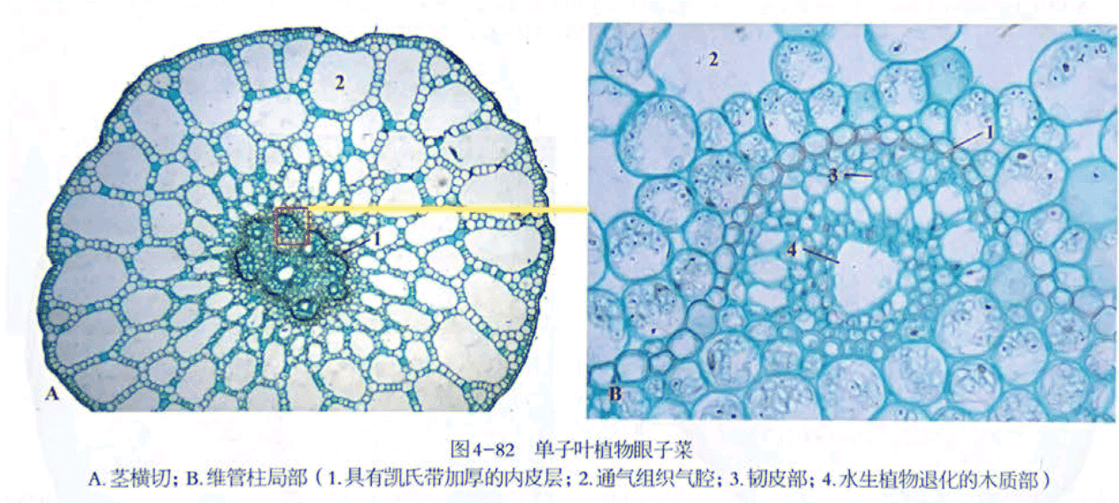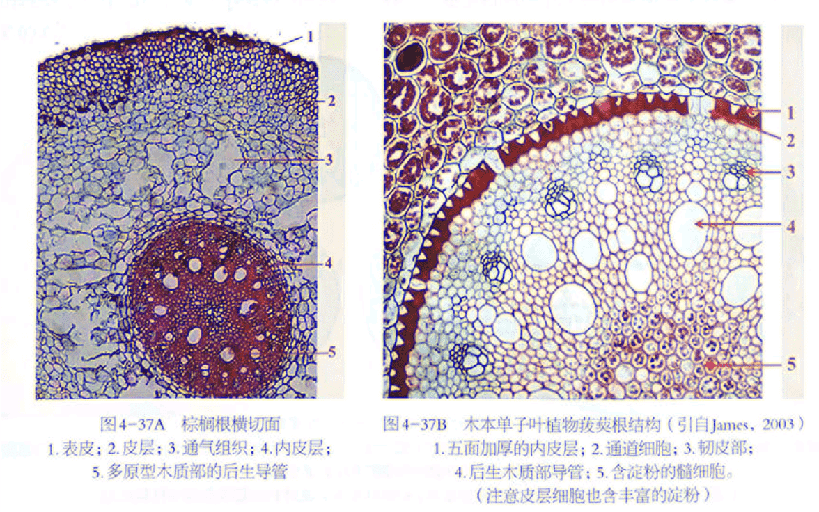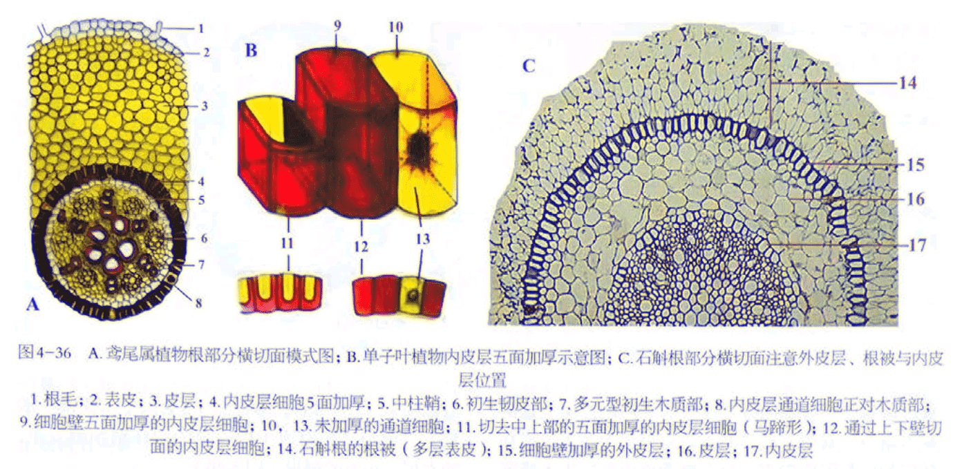 • 凯氏带双子叶植物的内皮层细胞的横壁径向壁木栓化带状增厚。由于其存在,一般认为内皮层可以主动控制根内水分和溶质的输导;溶质到内皮层后无法通过质外体途径移动,只有通过内皮层的原生质体进入中柱。