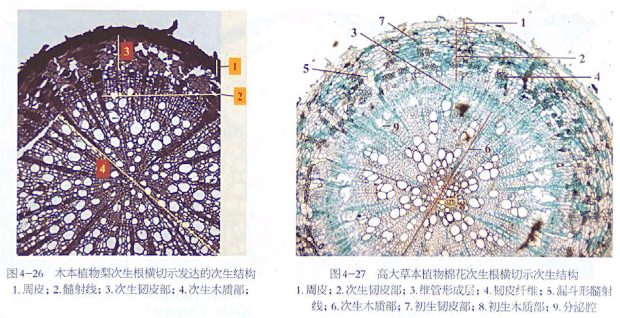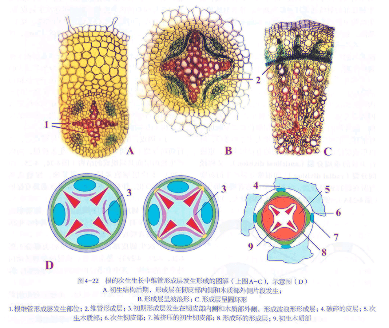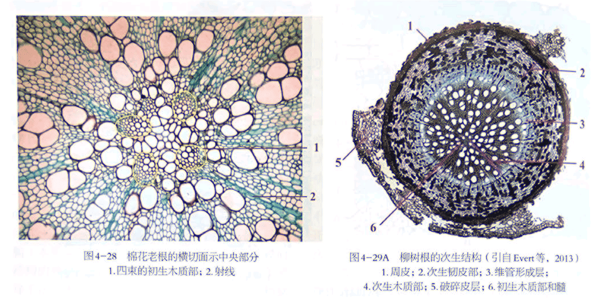 • 部分形成层细胞也分裂产生一些径向排列的薄壁细胞构成维管射线(根据部位分为木射线韧皮射线;两者通过维管形成层相连,成为根的横向运输结构)