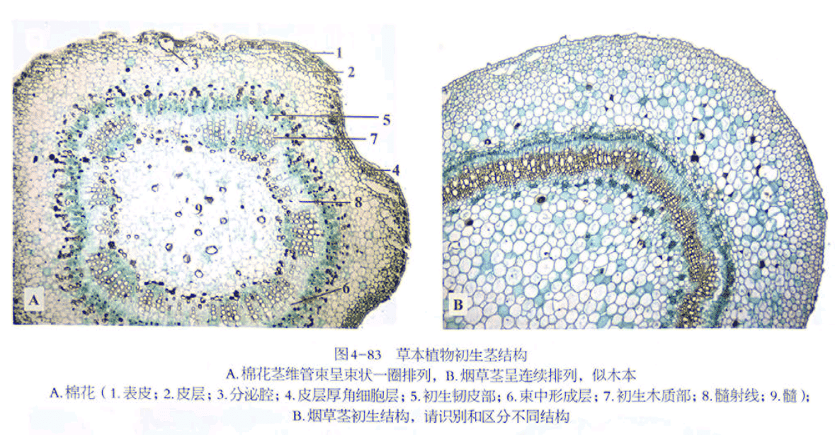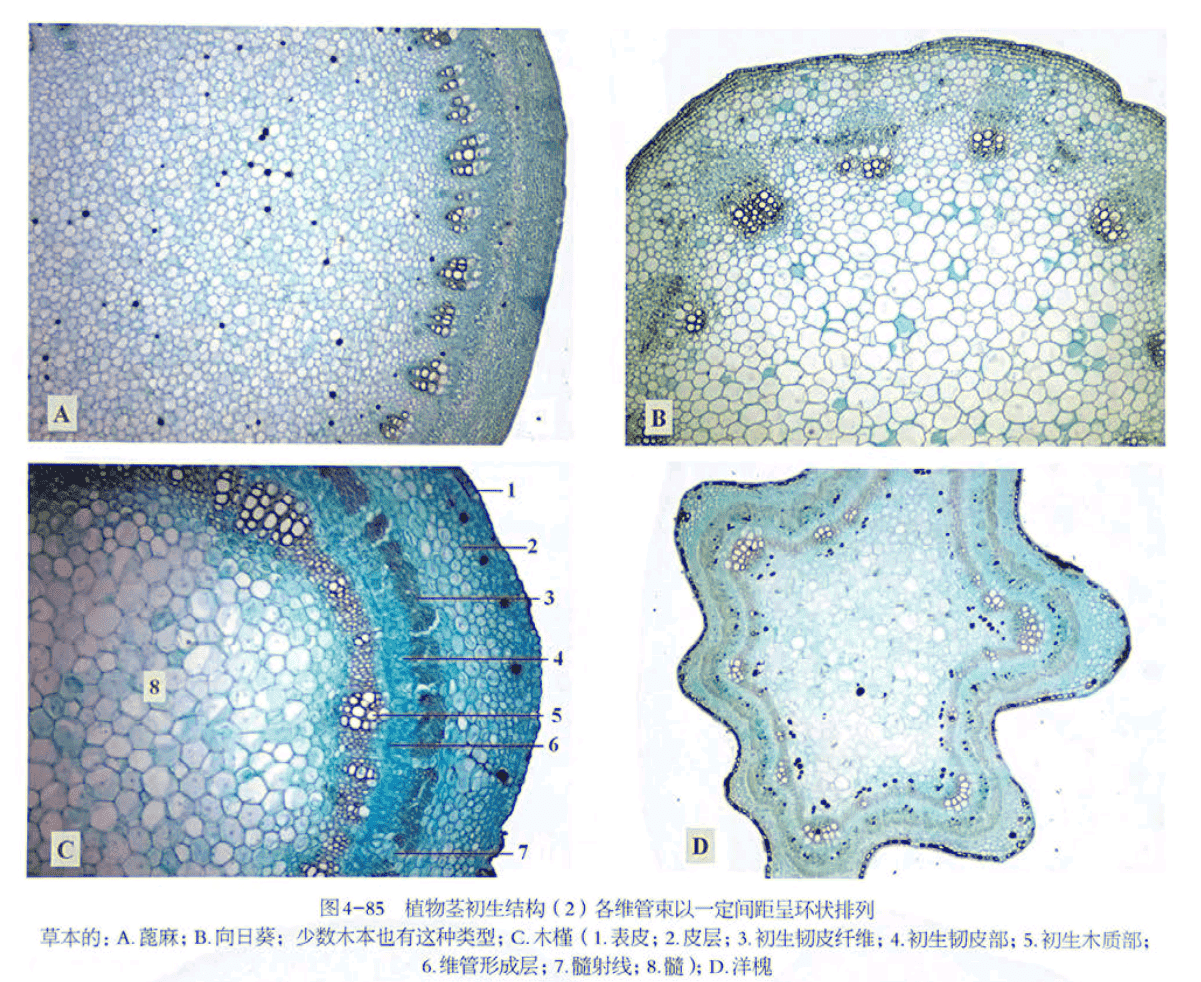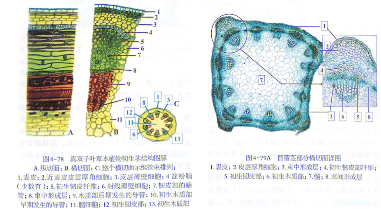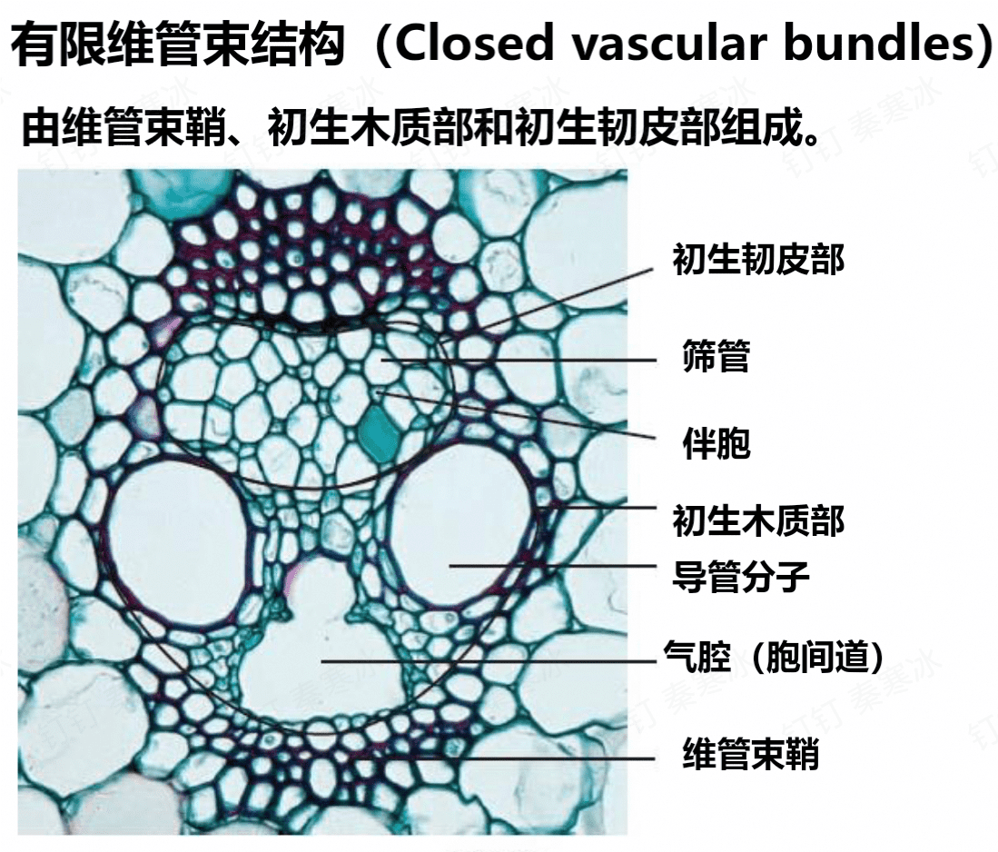• 初生维管束——初生韧皮部(向心发育、外始式)、初生木质部(离心发育、内始式)、束中形成层组成