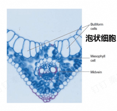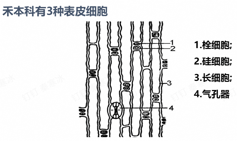 • 表皮:长细胞构成大部分、栓细胞细胞壁栓化、硅细胞内含大量二氧化硅;气孔器、表皮毛