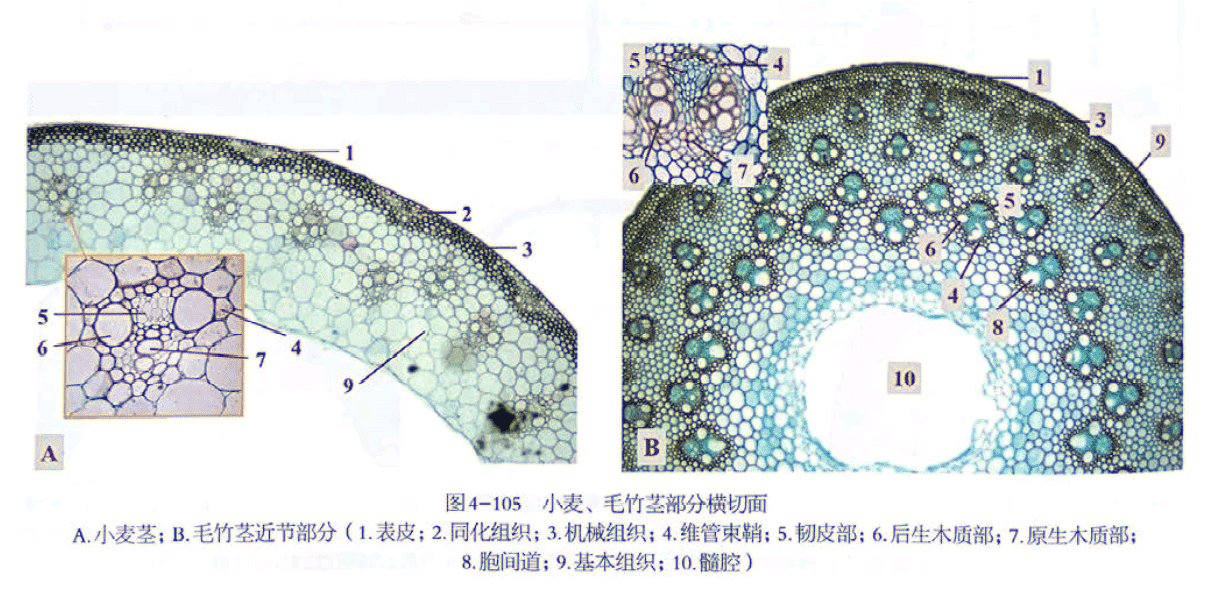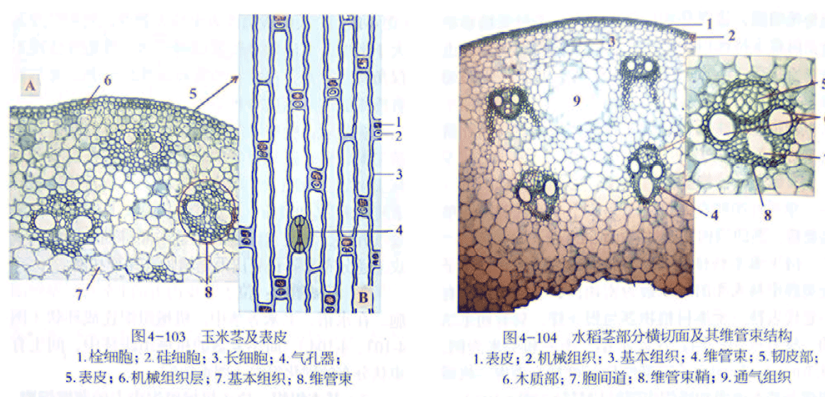 • 单子叶植物茎的初生结构: 禾本科植物茎的结构:表皮、机械组织、基本组织、维管束