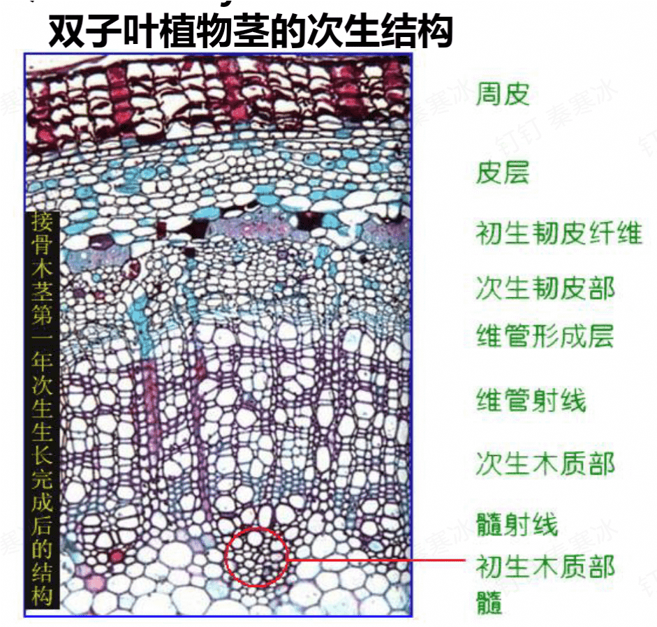 • 维管形成层产生 与束中形成层相连的髓射线转变为束间形成层,两者相连成维管形成层环 维管形成层:纺锤状原始细胞主要,切向分裂,形成次生韧皮部和次生木质部,构成轴向系统)、射线原始细胞(切向分裂,产生径向排列的维管射线并延长髓射线,构成径向系统