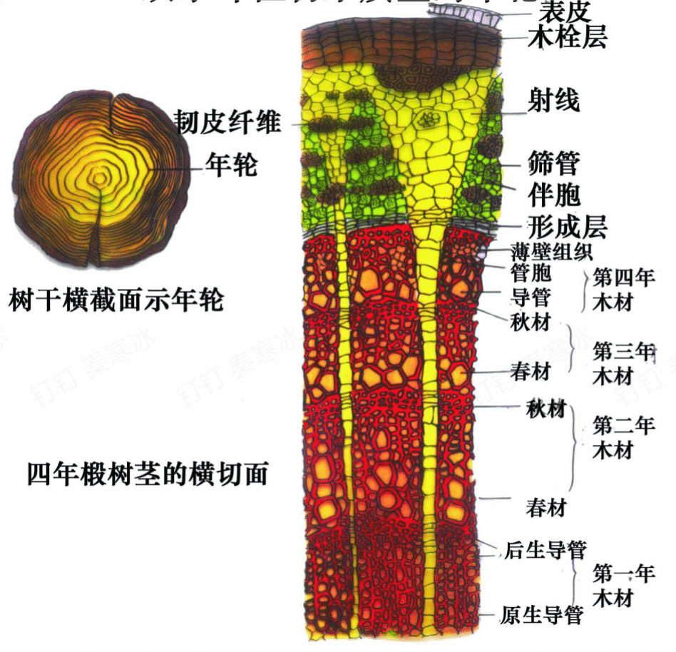 • 晚材:双子叶植物茎在每年生长季节晚期形成的次生木质部,导管直径小,壁厚,木纤维多,材质紧密。