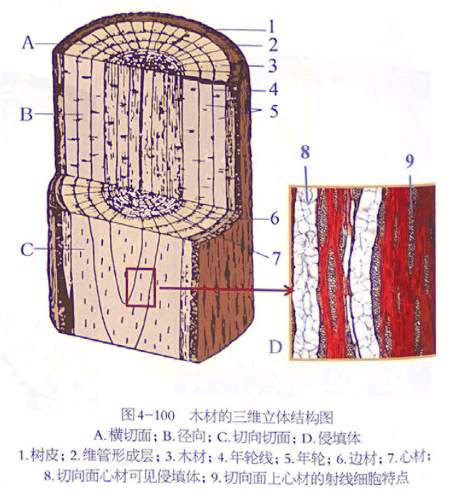 • 心材:靠近茎中心部分的木材。这部分次生木质部,颜色深,导管常被侵填体堵塞失去输导功能,其他细胞成为死细胞。