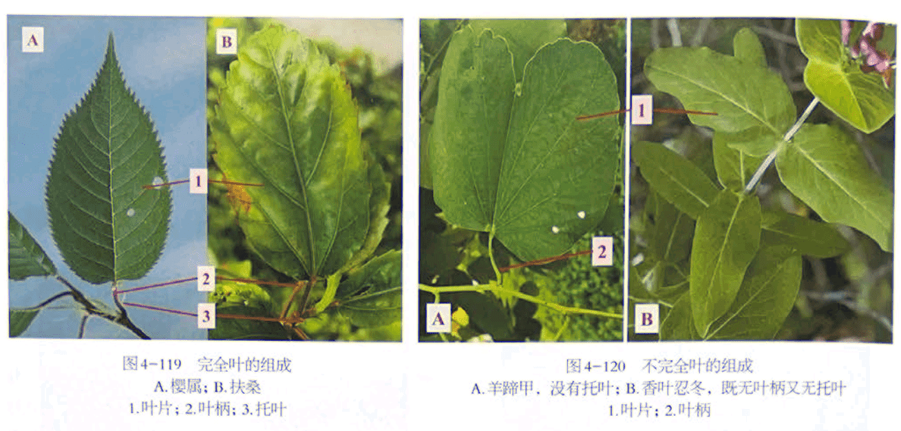 • 双子叶 叶片、叶柄、托叶(三部分都有是完全叶,缺少任何一部分或者两部分为不完全叶) 叶柄:连接叶片与茎的部分 托叶:叶柄基部附属物(常在叶发育早期起保护作用,一般植物托叶早落)