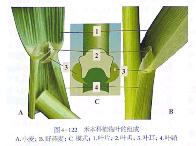 • 单子叶禾本科 叶片、叶鞘、叶枕(叶环)、叶耳、叶舌