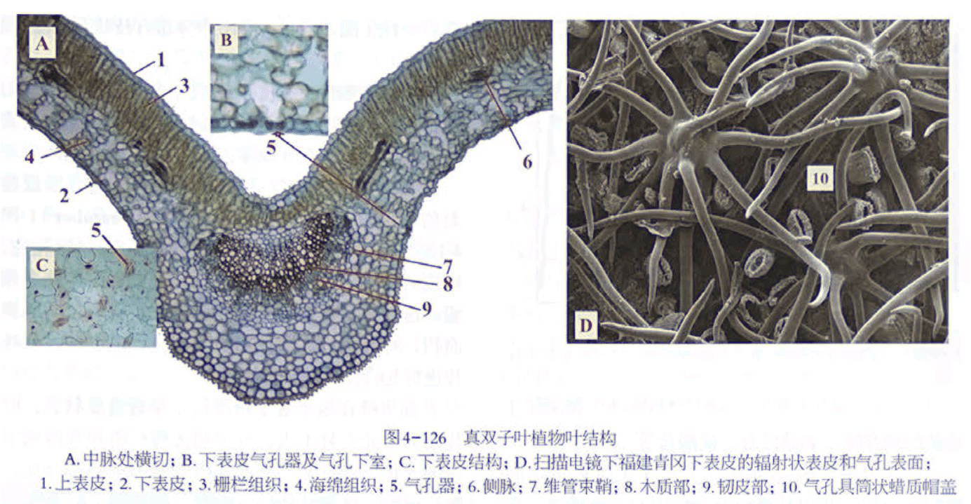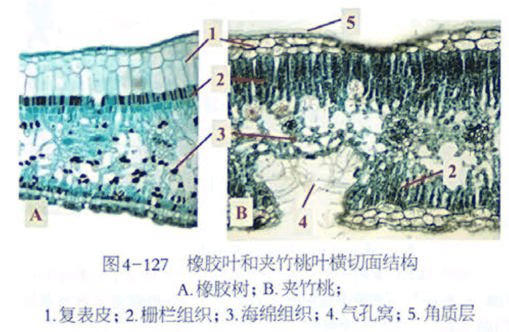• 表皮:上表皮(近轴面);下表皮(远轴面)。 大多植物叶表皮为一层生活细胞(表皮细胞、气孔器、表皮附属物、排水器等组成);但夹竹桃、橡胶树和高山栎植物中有多层细胞(复表皮)。气孔器由两个肾形的保卫细胞(细胞壁厚薄不均,气孔一侧偏厚)和之间的气孔(细胞间隙)组成,有的保卫细胞旁边还有副卫细胞