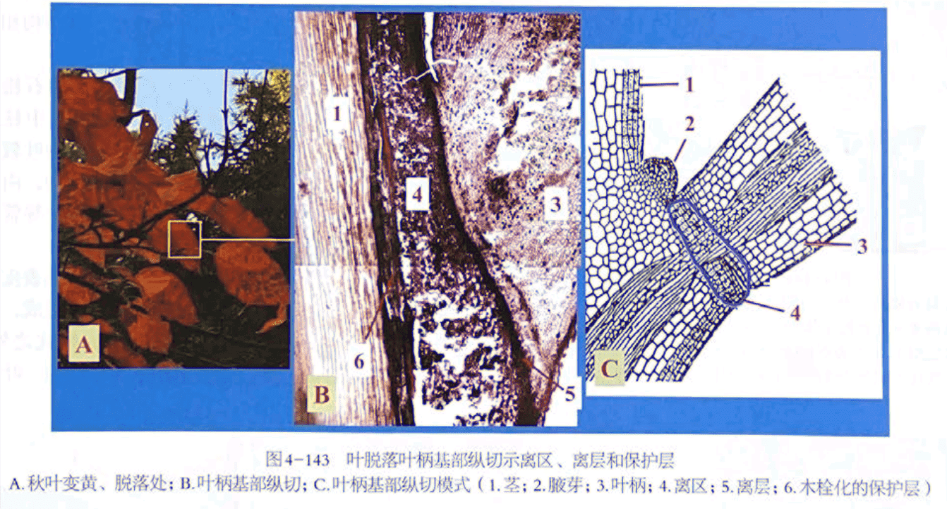 • 落叶与离层 落叶前,叶柄基部或近基部的某些细胞发生变化,形成离区 离区的一些细胞胞间层果胶酸钙转化为可溶的果胶和果胶酸,导致胞间层黏液化和溶解,形成离层(发生分离的部位) 离层断裂处的细胞层,其细胞壁发生栓化,有时在细胞壁和细胞间隙内还有木质、伤胶沉积,形成保护层