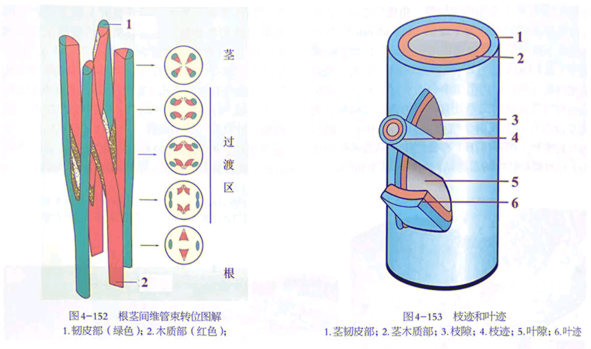 • 叶迹维管束:从茎中柱斜出穿过皮层到叶柄基部为止的这段维管束