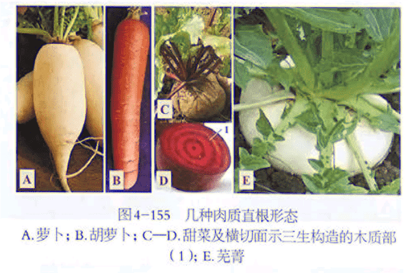 • 贮藏根 肉质直根(主根膨大):萝卜、胡萝卜、甜菜