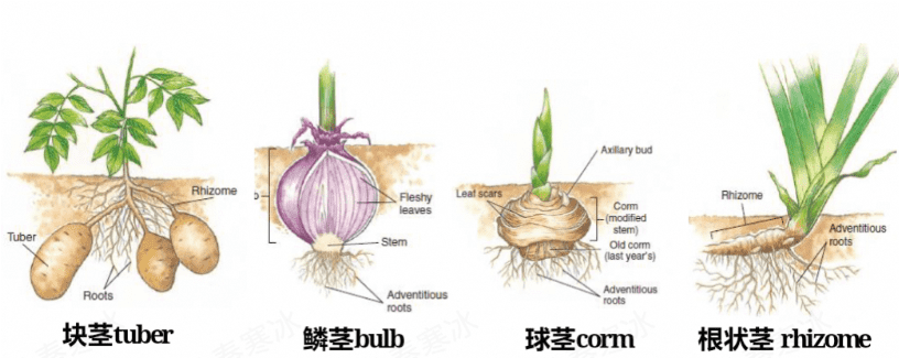 • 块茎:马铃薯、山药、天麻 鳞茎:洋葱、百合、蒜、郁金香、水仙 球茎:慈姑、番红花、芋头、荸荠 根状茎:竹、莲、生姜、美人蕉