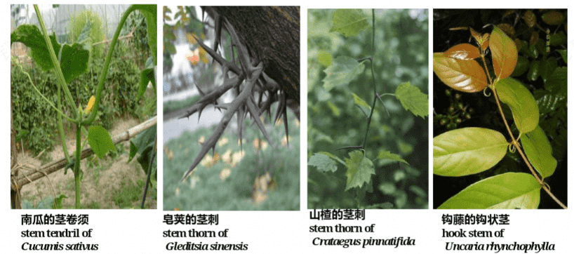 • 茎卷须:葡萄、南瓜、黄瓜、盘山虎(顶端吸盘状) 茎刺:山楂、皂荚、橘(ps.蔷薇、月季、玫瑰茎上的词刺是表皮突起物,没有维管组织相连,易于剥落,剥落平坦——皮刺) 钩状茎:钩藤 肉质茎:莴苣,仙人掌,榨菜 叶状茎:竹节蓼、昙花