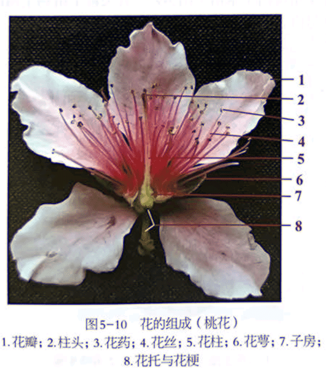 • 一朵完整的花有:花柄(花梗)(着生花的小枝)、花托(花梗顶端略膨大部分)、花萼(最外一轮变态叶,若干萼片组成)、花冠(若干花瓣组成)、雄蕊群、雌蕊群