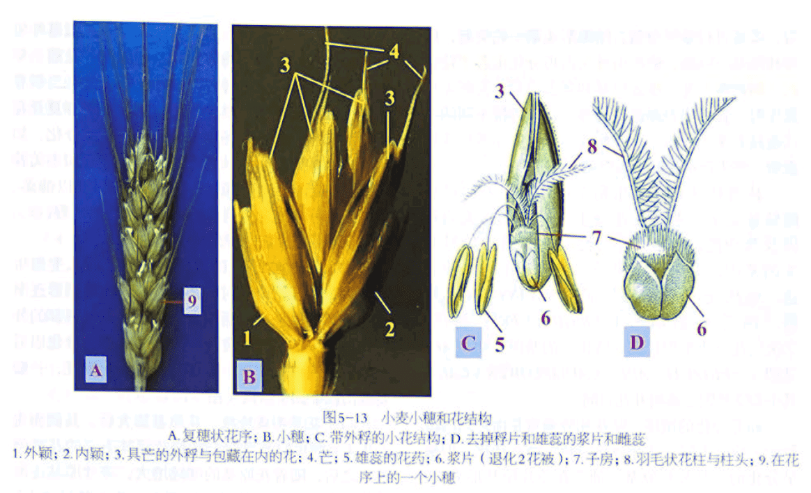 • 总状花序与穗状花序 :总状花序——十字花科、豆科(紫藤);穗状花序——禾本科小麦、大麦