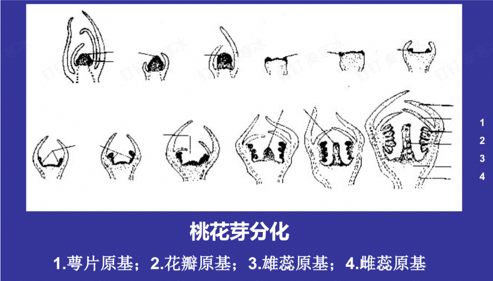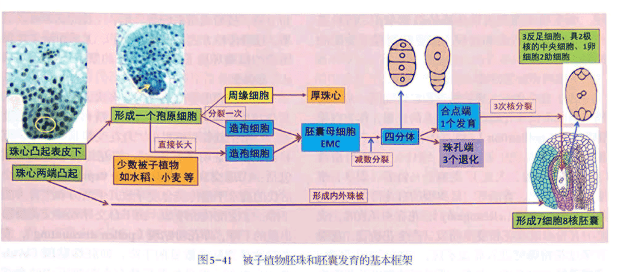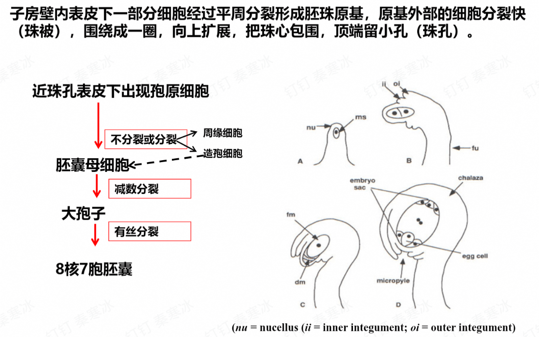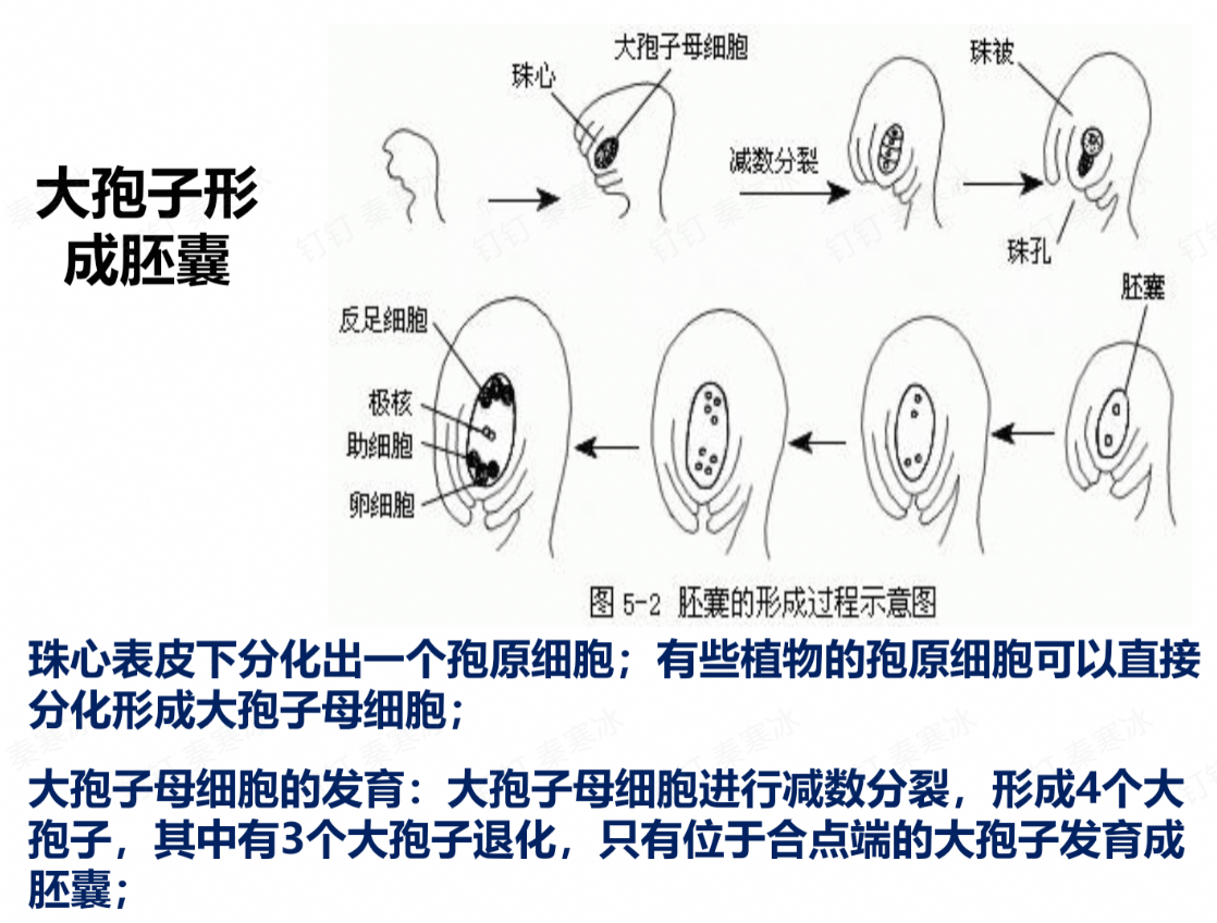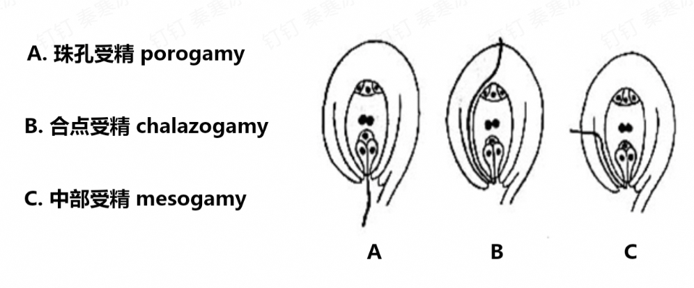 • 受精:珠孔受精(花粉管从珠孔伸入)、合点受精(合点端进入胚囊)、中部受精(穿过珠被,从侧面进入胚囊)