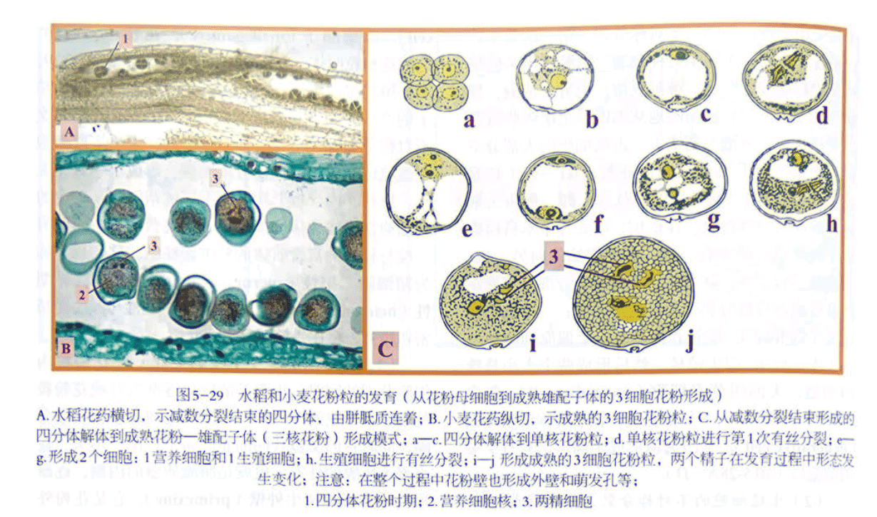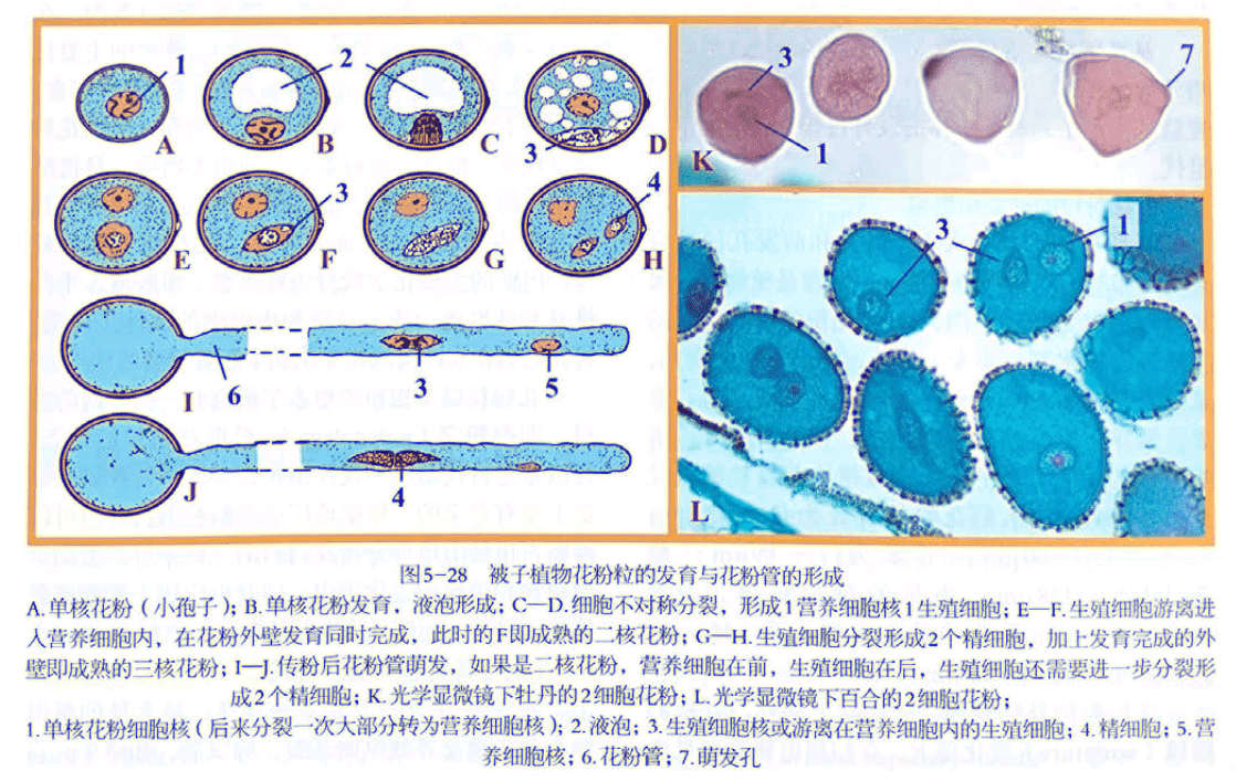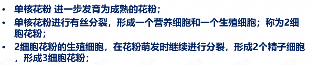 • 花粉粒发育:小孢子(单核花粉粒)细胞核在近壁处不对称分裂,偏液泡一极的营养核,偏原细胞核一极的生殖核。再形成大小两细胞(大——营养细胞;小——生殖细胞
