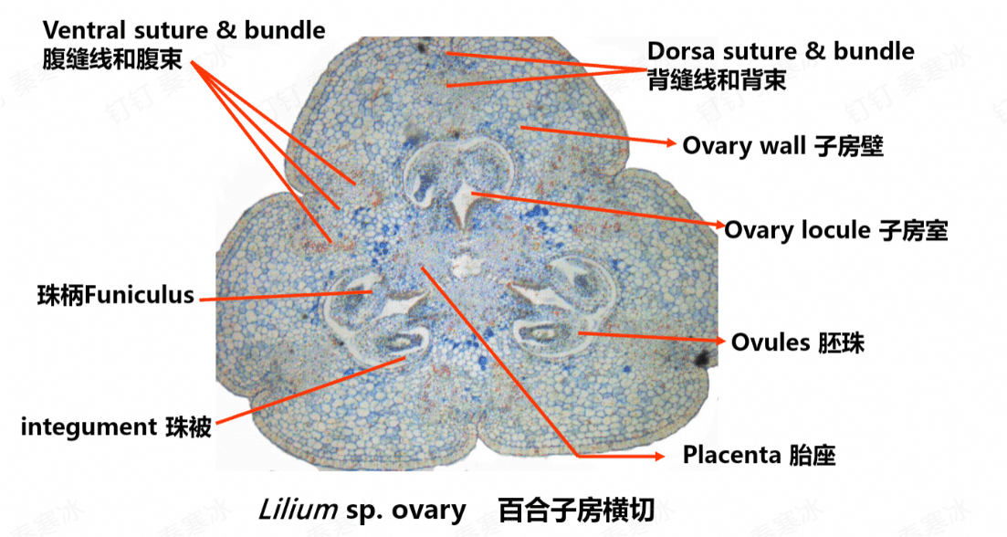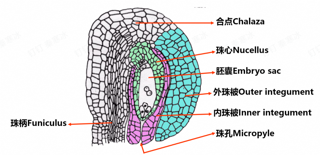 • 胚珠由珠心,珠被,珠柄,珠孔和合点等几部分组成。胚珠一般着生在心皮的腹缝线。