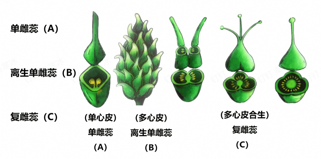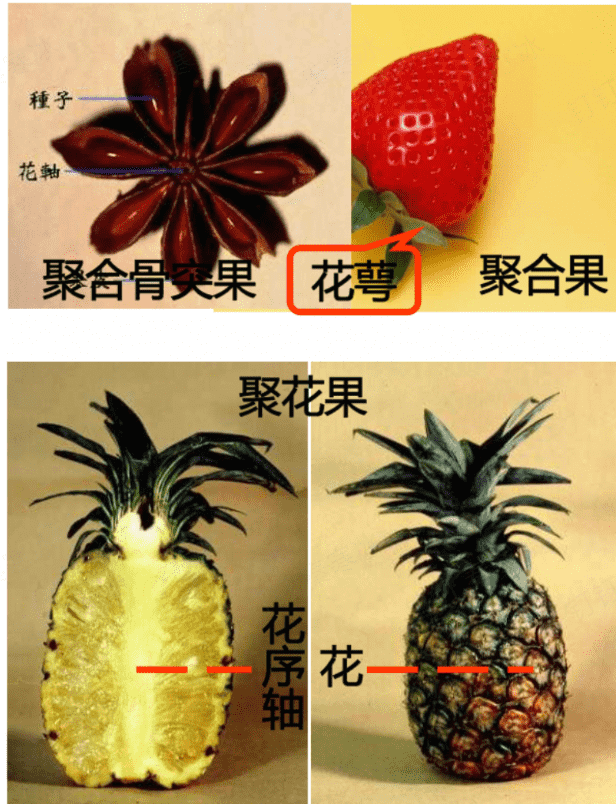 • 聚合果与聚花果 :聚合果——木兰科、毛茛科、五味子科eg. 草莓、蔷薇、牡丹、悬钩子;聚花果——桑科、凤梨科eg. 桑葚、菠萝、无花果