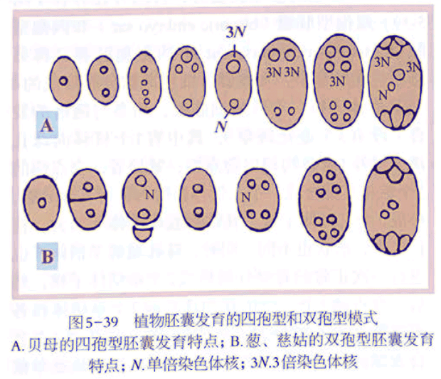 • 沼生目型:介于核型与细胞型,第一次核分裂后把胚囊隔成二室,大——珠孔室,小——合点室;之后每室分别进行核分裂,珠孔端多,最后成细胞结构;合点室少,最后保持游离核状态。