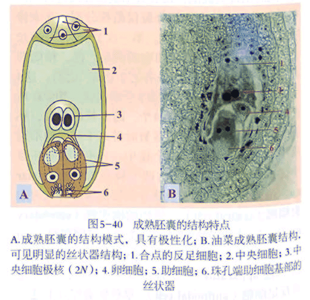• ps.有的植物极核在受精前常融合成中央细胞二倍体的次生核;珠孔端1个卵细胞(高度极化,珠孔端壁较厚,核偏向合点端)和2个分化的助细胞(明显极化,细胞壁也是珠孔端厚,珠孔端部分细胞壁内向延伸成指状突起,称为丝状器;细胞核偏向珠孔端)合称为卵器;近合点端3个核分化成反足细胞 —— 7细胞8核。(蓼型胚囊,被子植物中最常见。