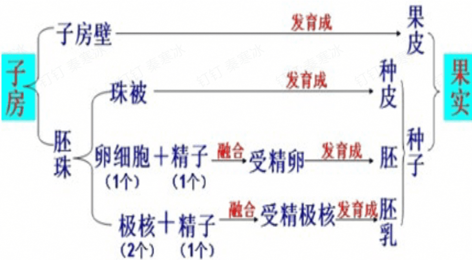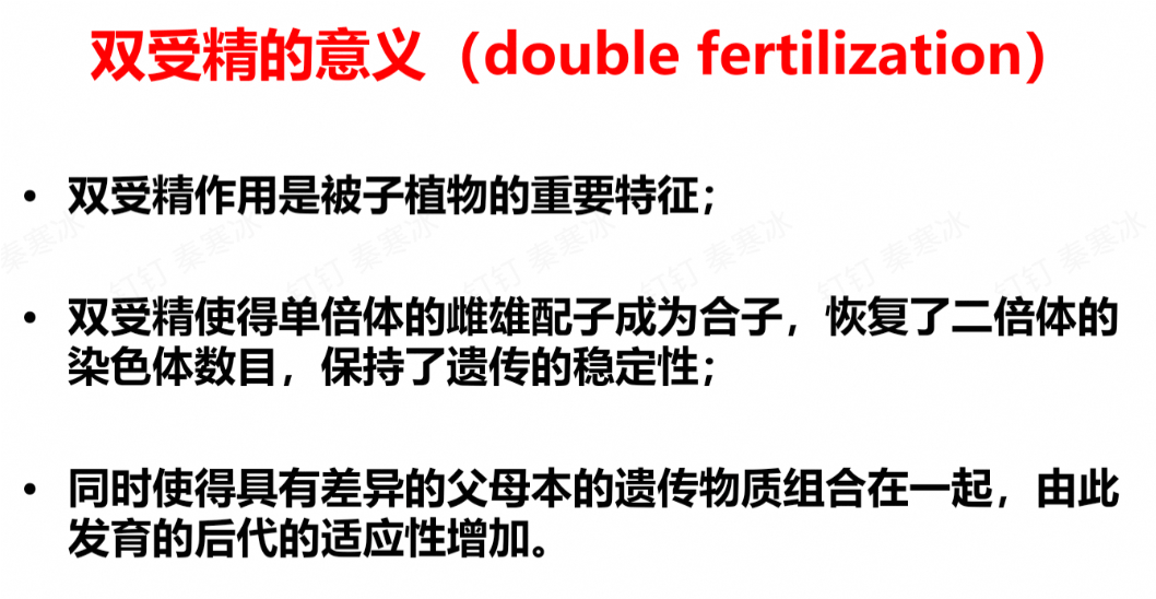 • 双受精:被子植物特有的一种受精方式,指花粉管中的两个精子分别与胚囊中的卵细胞和中央细胞(极核)融合的过程。