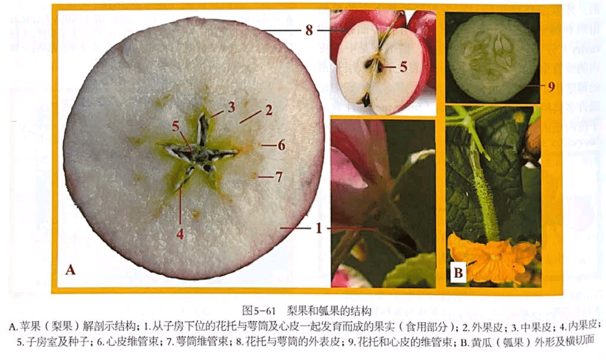 • 假果:还有花托、花萼、花序轴等其他花器官参与形成 梨和苹果心皮外围组织被认为是贴生或愈合在心皮的花被,称为花筒或萼筒,使用部分主要由花筒发育而来。