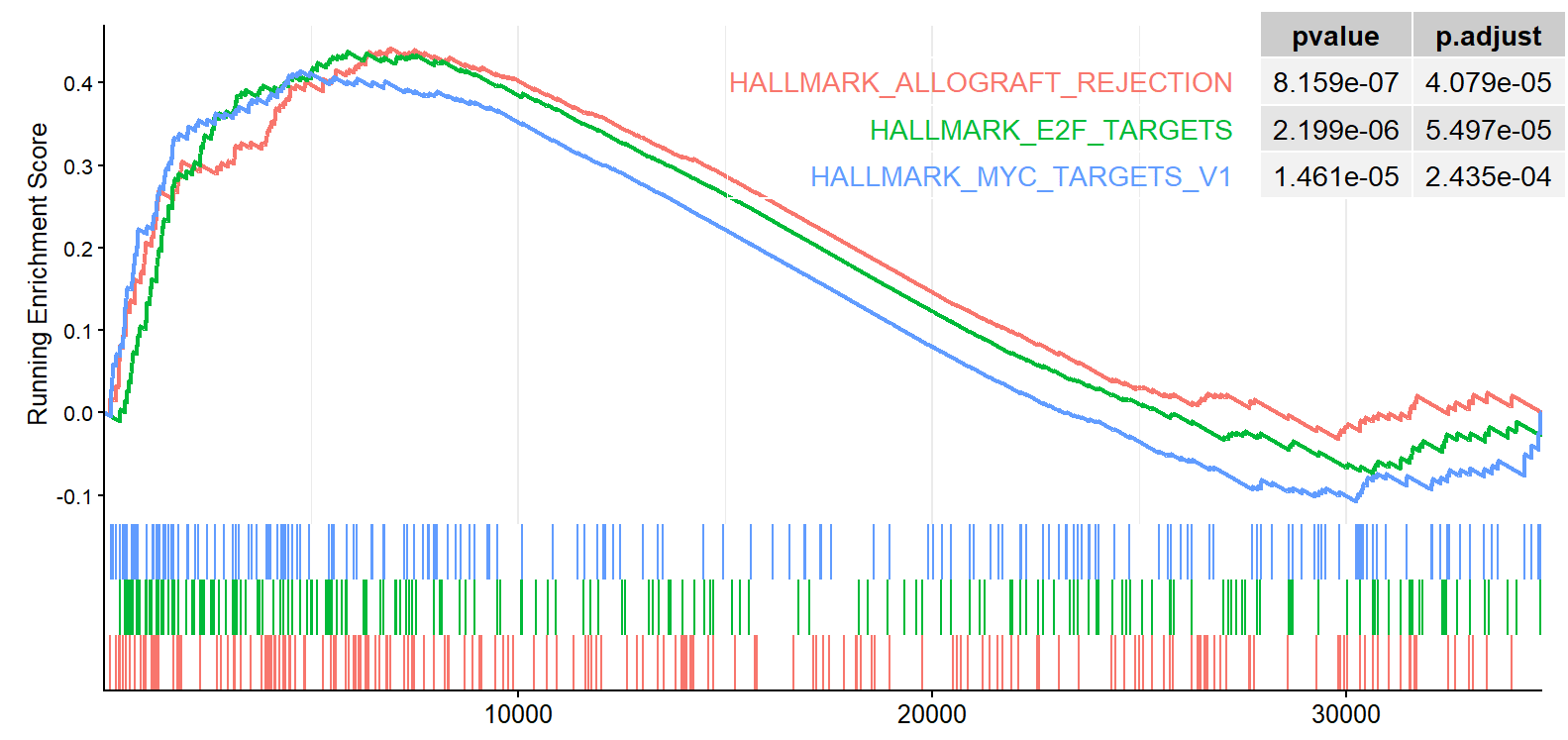 p1 <- gseaplot2(GSEA,geneSetID = 1:3,pvalue_table = T, subplots = 1:2)
