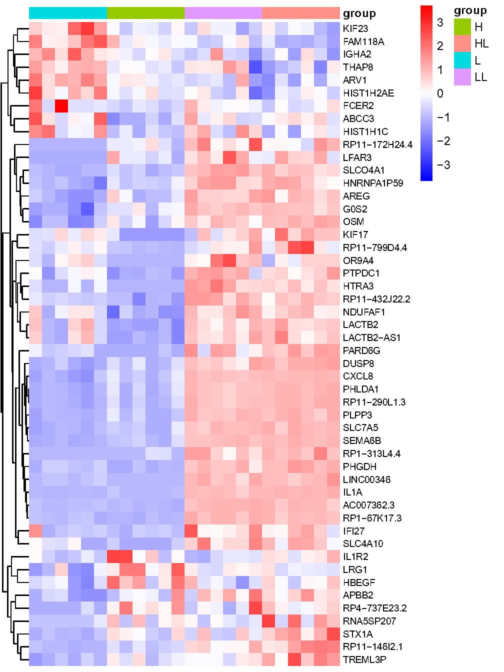 # 选取的基因表达如果是大于这一组中的中位数,则认为是上调,完成单个基因的高表达或低表达区分