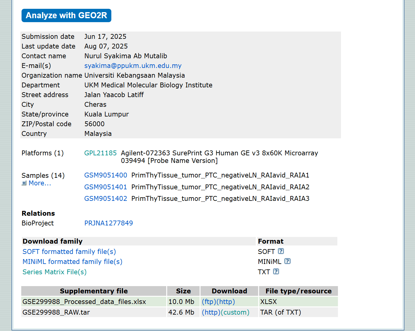 • Platforms:(GPLxxxx)平台编号对应的检测技术体系,包含了探针序列与基因的对应关系,是后续进行探针 ID 转换为基因 Symbol/Ensembl ID 的必需文件,直接影响下游功能富集分析的准确性。