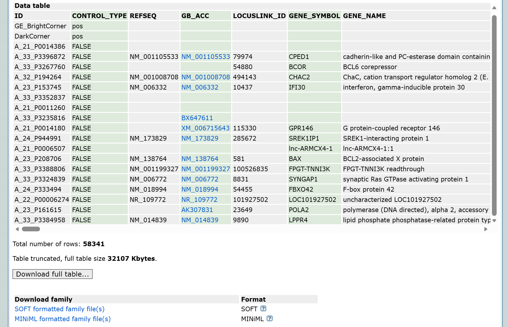 • SOFT formatted family file(s) 、 MINiML formatted family file(s):包含原始信号和所有元数据,信息非常全,但格式比较复杂,适合进阶分析。