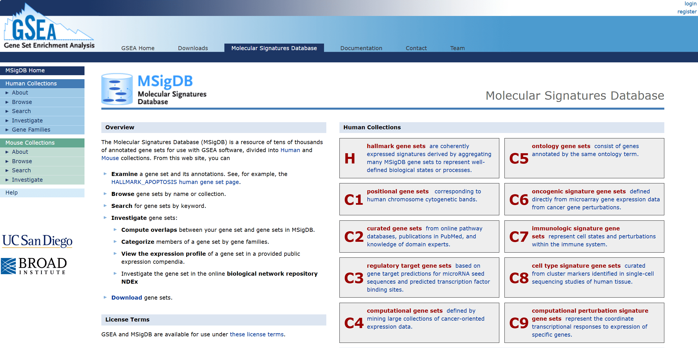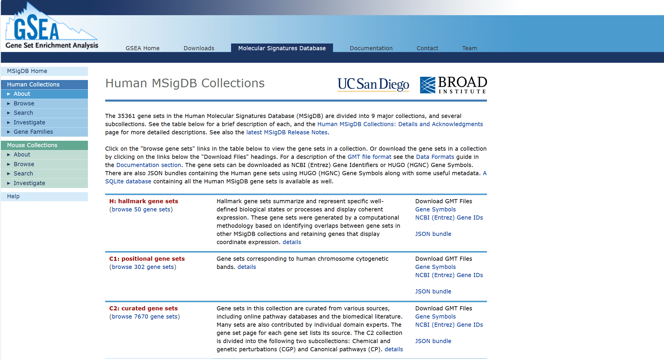 如下是进入页面后的Database页面,右侧的 Human Collections 就是给人类研究用的 10 类基因集