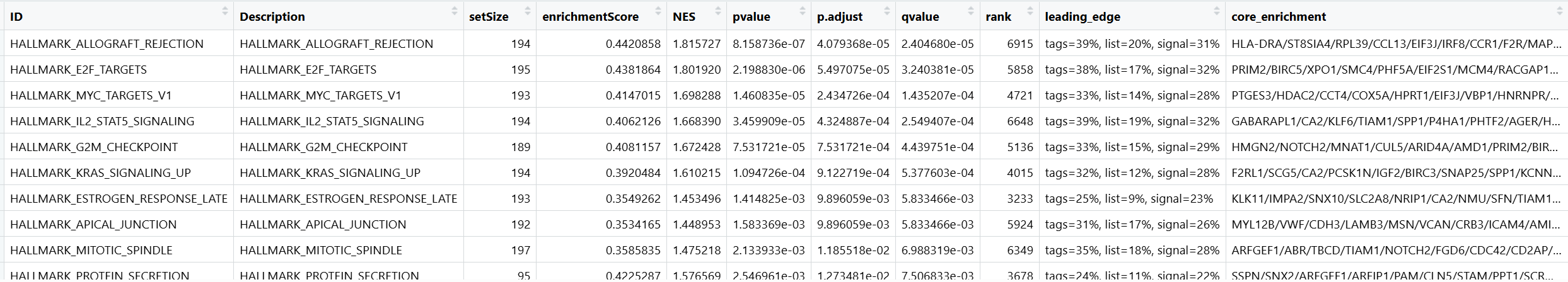leading_edge:核心富集基因的标签。tags:核心基因占该基因集的比例;list:占全基因列表的比例;signal:富集信号强度